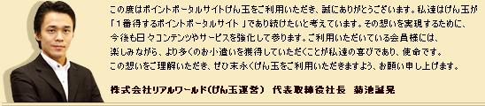 ![]() ![]() ![]() ココからの登録で250Ptもらっちゃお~~♪ 昨日に引き続き、【3万円の館応募完了】メールの内容です。 <ここから引用> 最後にお詫びをさせてください。。。 昨日の新コーナー告知に対して、すごくげん玉を愛して下さっている 会員様からお叱りを頂戴しました。 皆さんに喜んでもらいたい一心で新コーナーのお知らせをしたかった のですが、ご愛用いただいている皆様に対する配慮が足りない軽々しい 文章だったと反省してます。申し訳ございませんでした。 <ここまで引用> 新コーナー設立に大変喜んでいたのですが、 『会員からお叱りを頂戴した』とは、何かあったのでしょうか? 掲示板の方では、『旧1万円の館の30Ptを復活しろ~~~!』という 意見はたくさん目にするのですが…。 新しいコーナーを立ち上げるのだから、 現状よりポイントを稼ぎやすくなるワケですよね? それってイイ事じゃないんかな? まさか、新コーナー設立廃案?ってことはないですよね? 単に、『文章に不快を感じた会員がいた』ってコトですよね? 廃案は絶対ダメだよ! ![]() ![]() ![]() ココからの登録で250Ptもらっちゃお~~♪ ![]() ![]() ![]() ココからの登録で250Ptもらっちゃお~♪ 久々にげん玉登録画面を開くと、ちょっぴり変化が… いつの間にやら、社長さんのお姿が貼られているではありませんか! 意外にお若いんですね。 クリックして拡大社長さんのブログ【リアルワールド社長のBLOG】(そのまんまじゃん!) もあるみたいですね。 興味があられる方はどうぞ♪ ![]() ![]() ![]() ココからの登録で250Ptもらっちゃお~♪ ![]() ![]() ![]() ココからの登録で250Ptもらっちゃおう♪ 本日の【3万円の館応募完了】メールにて、とても気になる記述がありました。 みなさん気づきましたか!?では、その気になる記述とは… <ここから引用> 【大野彩から速報】 近日中に毎日参加するだけでポイントをもらえるコーナーが始まります! ふふふ、このコーナーはいわば「1万円の館復活」みたいなものなので、 皆さんお楽しみに! <ここまで引用> こっこれは、新コーナーの予告! (3万円の館で消滅したクリックポイントが復活するのかな?) ココだけの話ですが、げん玉の掲示板では、 旧1万円の館のクリックポイント消滅にスゴイ反発がありました。 まぁ、私もクリックポイントの消滅にはガッカリした一人ですが…。 ぜひ新コーナーでは、クリックポイントが復活することを願いたいです! ![]() ![]() ![]() ココからの登録で250Ptもらっちゃお~~♪